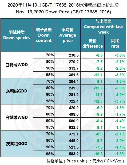 In order to keep abreast of the market situation of down industry meanwhile maintain healthy market competition order, CFDIA has invited several down companies in domestic key down production areas to participate in a routine statistic of finished down price and summarized all data. From now on, CFDIA will release the summarized quotation on a regular basis.