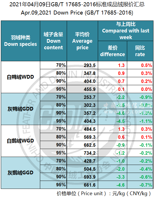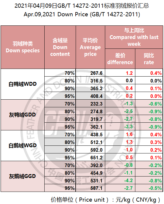 In order to keep abreast of the market situation of down industry meanwhile maintain healthy market competition order, CFDIA has invited several down companies in domestic key down production areas to participate in a routine statistic of finished down price and summarized all data. From now on, CFDIA will release the summarized quotation on a regular basis.